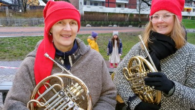 Nå under pandemien er det hyggelig å kunne spille sammen og for andre, uten å gå på akkord med smittevernet. Dette får vi til ved å stille med redusert besetning og ta på oss oppdrag ute der det er god plass. I dag for Sagene frivillighetsentral, som satte pris på vår lille minikonsert bestående av julesanger.