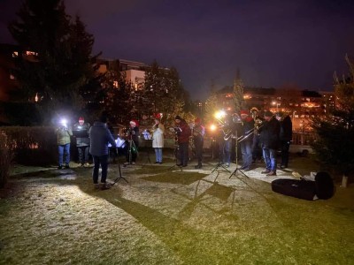 Nå under pandemien er det hyggelig å kunne spille sammen og for andre, uten å gå på akkord med smittevernet. Dette får vi til ved å stille med redusert besetning og ta på oss oppdrag ute der det er god plass. I dag for Sagene frivillighetsentral, som satte pris på vår lille minikonsert bestående av julesanger.