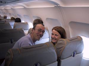 Thomas og Merethe gleder seg til å ta fatt på siste etappe fra fra Frankfurt til Valencia i den første gruppen som dro fra Gardermoen 06.30