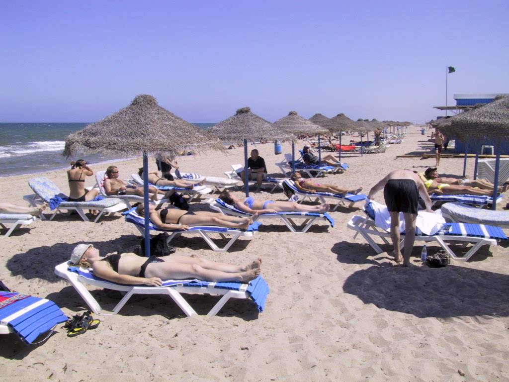 Stranden nedenfor hotellet skulle komme til å bli flittig besøkt i løpet av turen, og utleieren av standstoler gjorde kjempebutikk på SJKerne