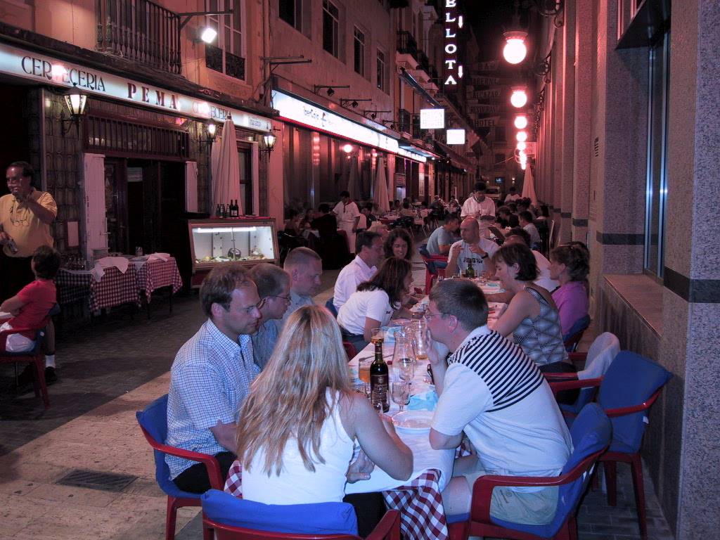 Det er noen ganger litt problematisk å få spise sammen når man er mange i flokk, men her gikk det greit. Vi er her på en restaurant ved siden av det mer berømte "Skinkepalasset"