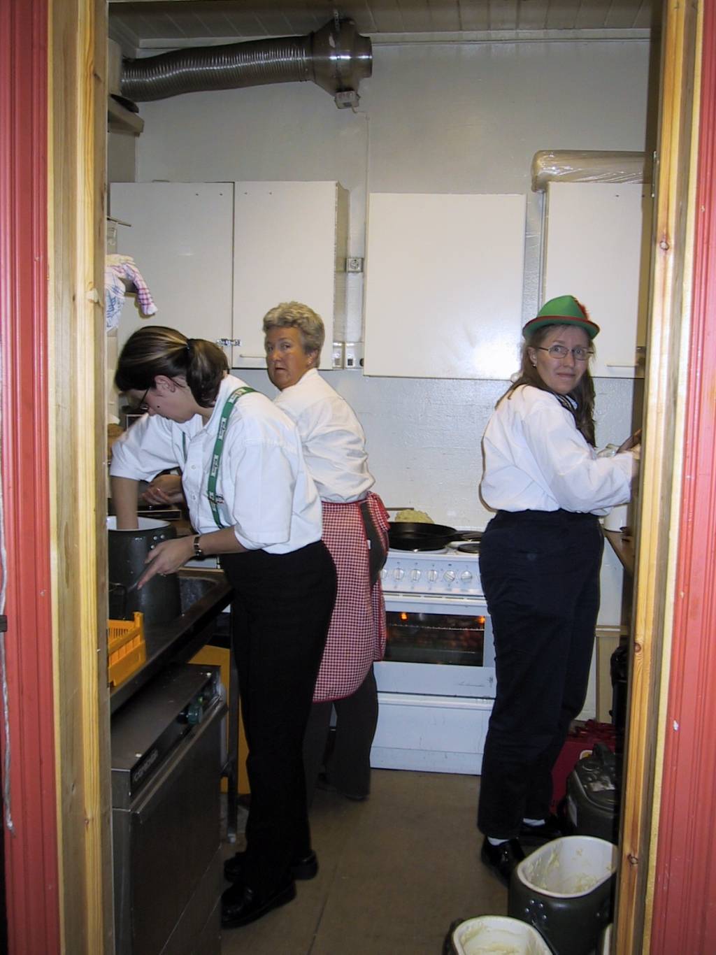 Kjøkkenet hadde sitt å stri med, ca 300 mennesker ble bespist og det uten problemer. Vanja, Ellen og Helen var blant de som kjempet, til tider ble bratwurst levert i springmarsj