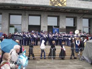 Korpset på rådhusplassen etter avsluttet barnetog. Nå venter konsert på rådhustrappa