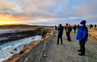 Imponerende natur ved Gullfoss, men surt og kaldt. Heldigvis hadde vi med klær, som Kjell Eigil på bildet