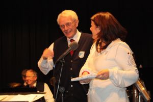 Æresmedlem i Sagene Janitsjarkorps - Kjell Bjørn Pedersen - fikk gave og hedersord fra korpsets leder - Merete - da han deltok på sin siste konsert som aktiv