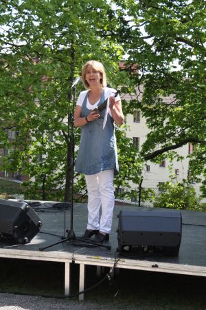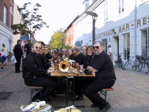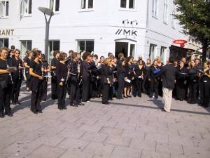 På formiddagen før konserten deltok vi i en gateparade og hadde en liten utendørskonsert i gågata i Fredrikshavn. Koret og korpset byttet på å underholde