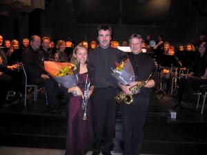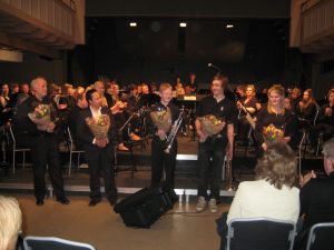 Velfortjent hyllest til dirigent for Sagene Janitsjarkorps - Tom Skjellum, Oslo Kretskorps - Ante Skau og solistene Lasse, Morten og Jeanette etter konserten 19. april