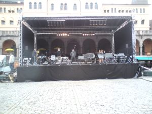 Et stort mannskap var i sving for å få scenen klar til kveldens fyrverkerikonsert på Youngstorget. Svært mange elementer skal være på plass og i samspill før en slik konsert. Lyd, lys og plass til over 60 mennesker på scenen.