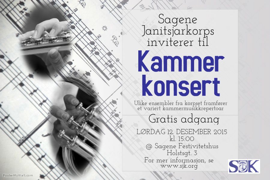 Velkommen til kammerkonsert hvor vi spiller musikk fra blant annet; Dukas, Reed, Rossini, Altenburg, Hurum, Debussy, Schiltknecht . Det blir KLANG fra; klarinettensemble, fløyteensemble, hornkvartett, trompet og paukeensemble, saxofonensemble, trombonekvartett, stort messingensemble, stort treblåsensemble og bluesband. Gjennom musikk skal vi begeistre også i førjulstiden!
