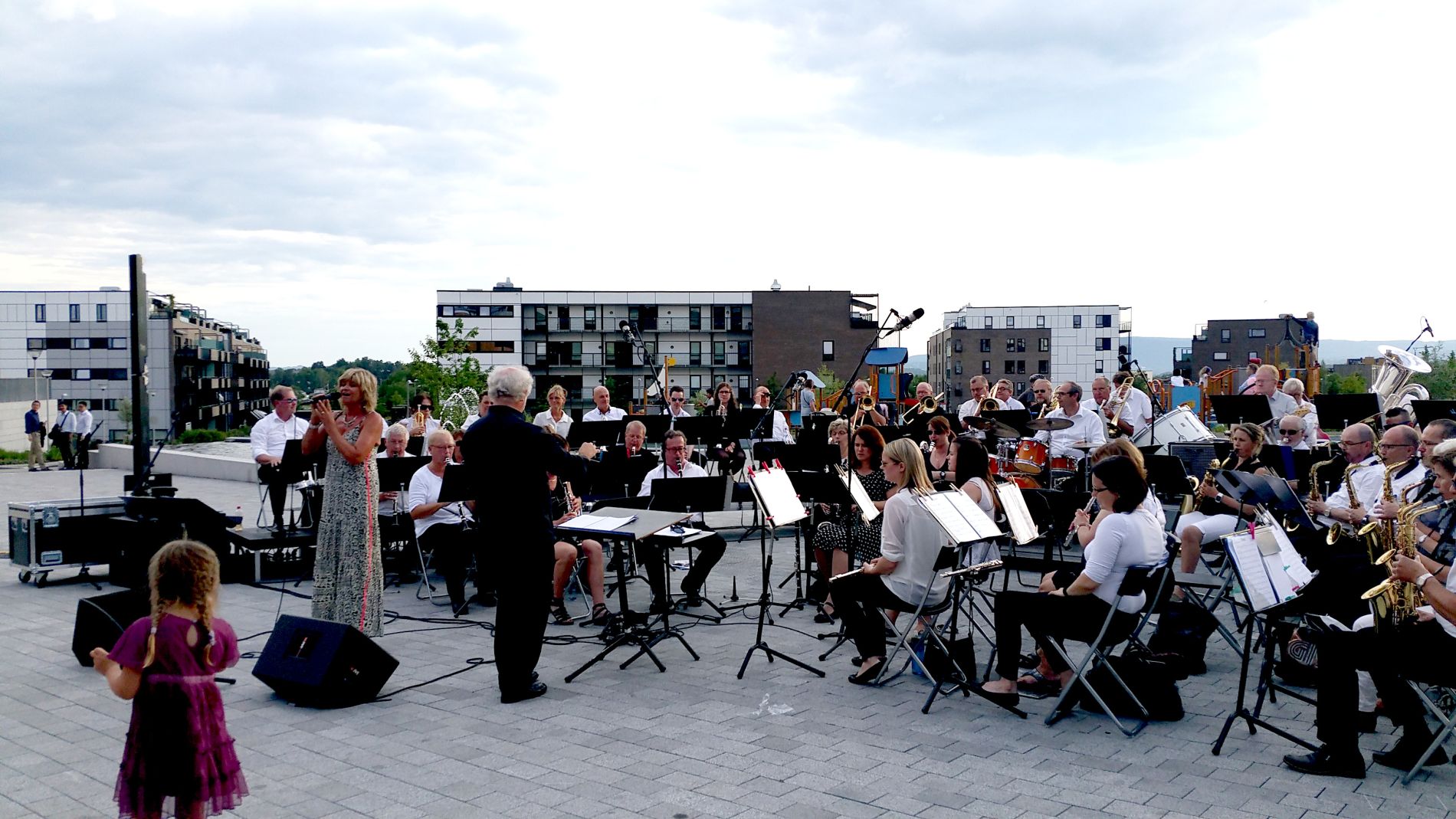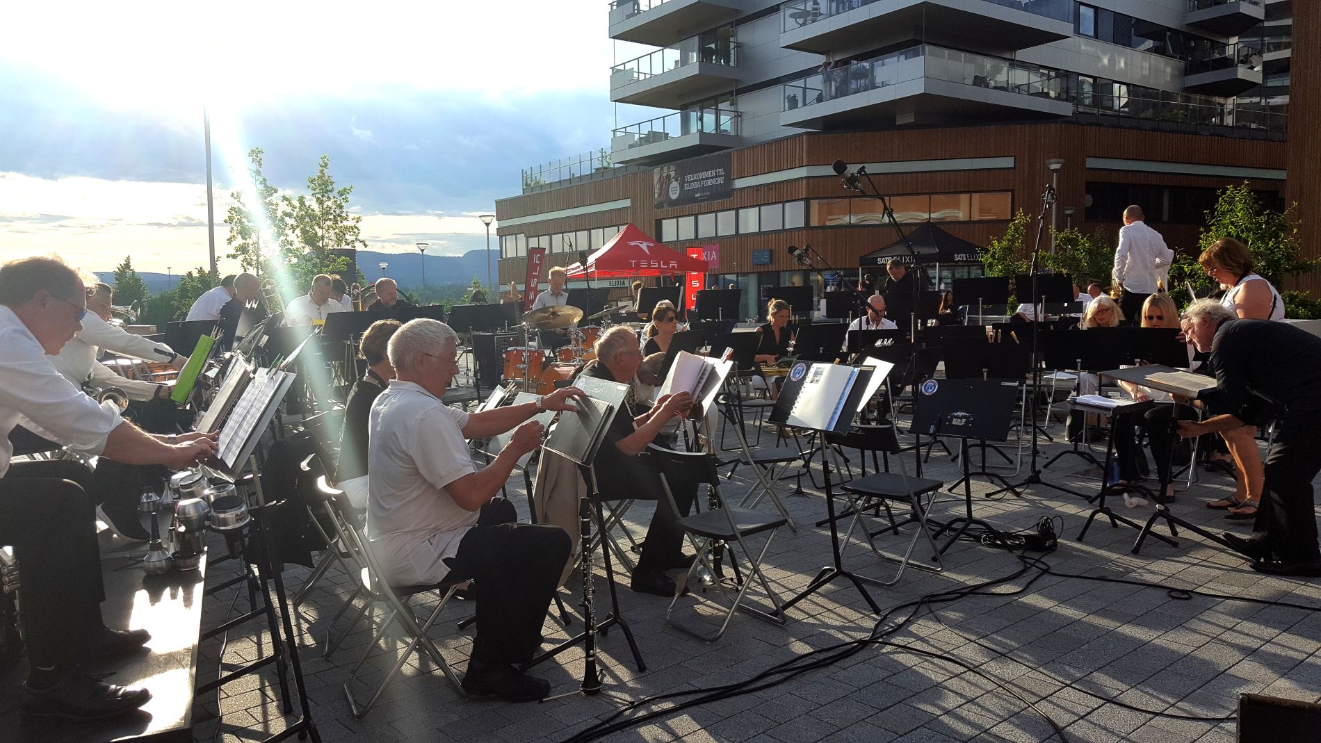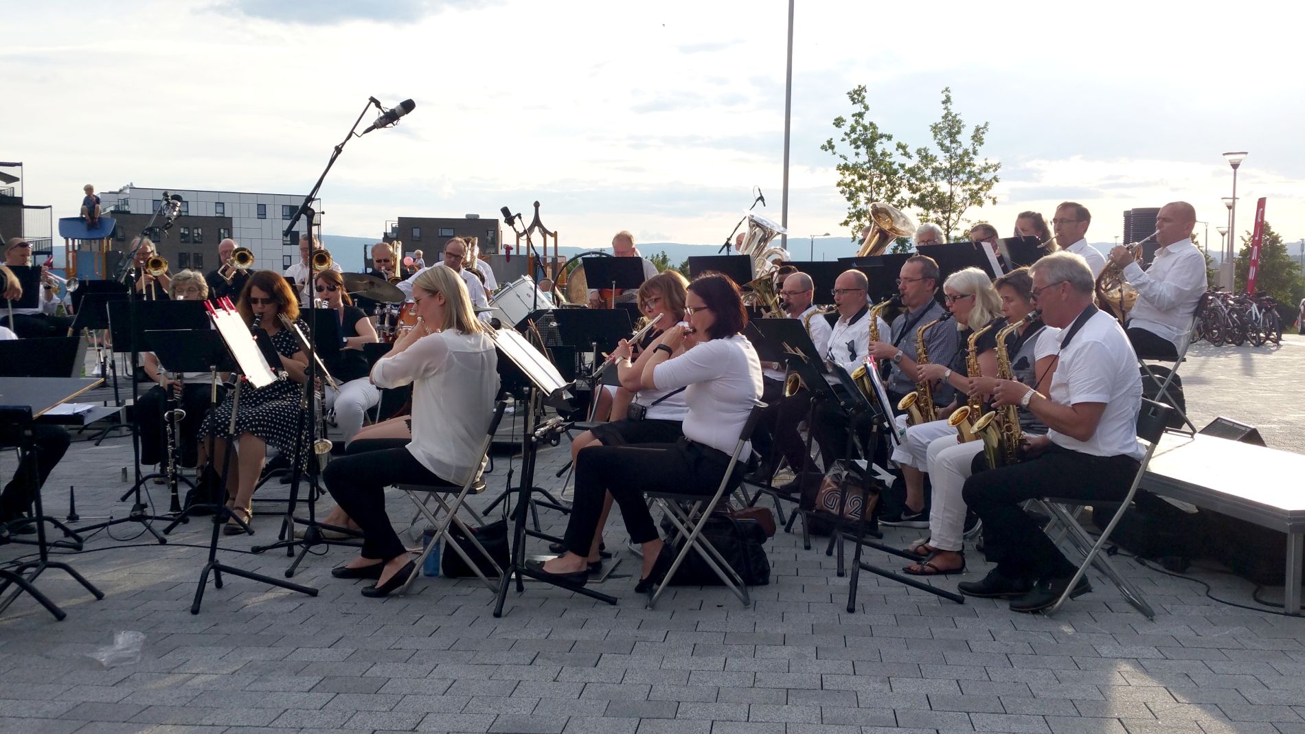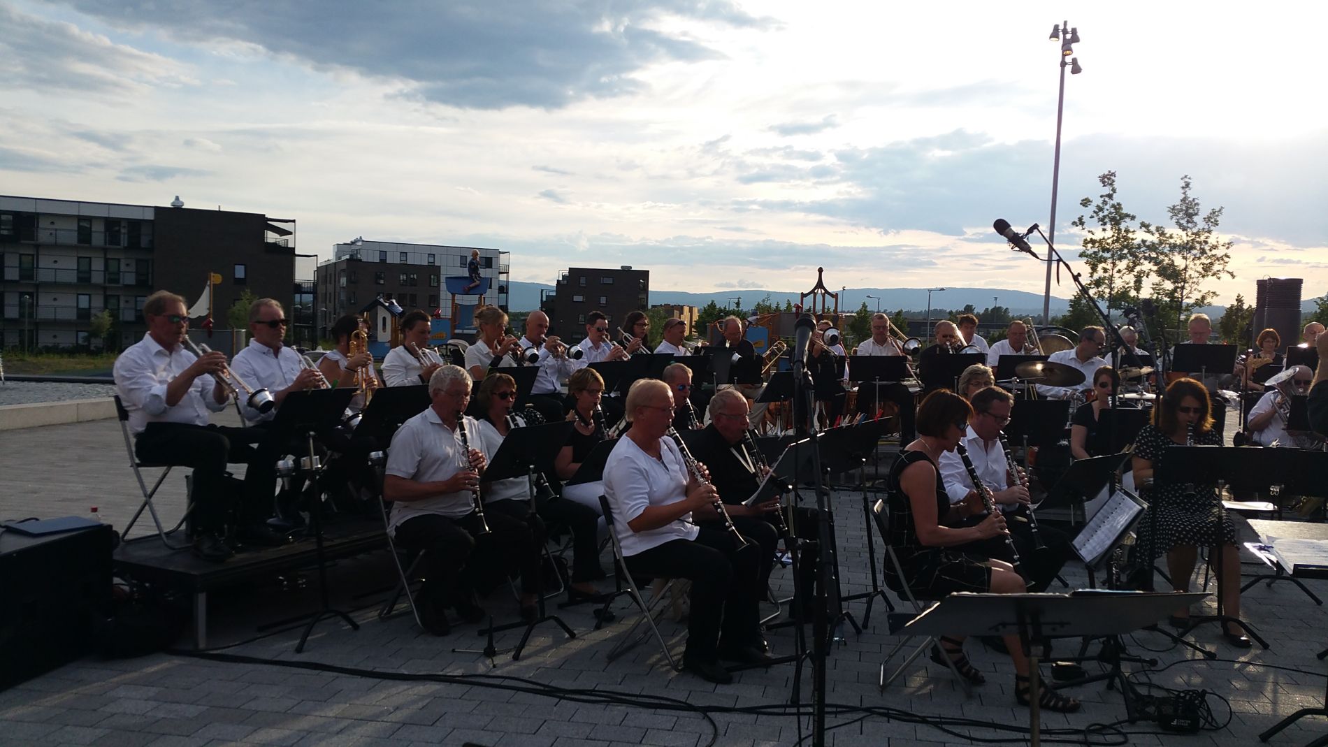 Vi hadde full klaff med været, og det var nesten noe sydlandsk over stemningen, med kveldssolen som farget Bærumsåsene røde, mens ensemblet underholdt publikum med svisker fra ny og gammel filmmusikk som nok var kjent for de fleste. Vi kan nevne filmer som Starwars, James Bond filmene Goldfinger og Skyfall, Chaplins Limelight, Funny Girl med Barbra Streisand og Omar Sharif og mange fler.