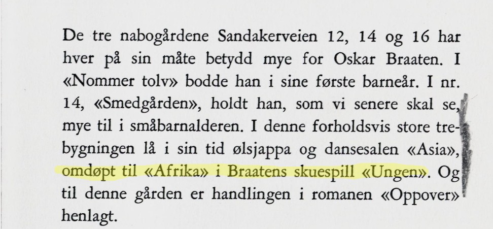 På min skolevei fra Sandakerveien 20 til Sagene skole fra 1958 til 1965 passerte jeg nummer 12, Oskar Braatens første hjem. Her bodde han til han var 5-6 år. Huset lå på hjørnet av Sandakerveien og Marcus Thranes gate. (Ring 2) Huset måtte vike plassen ca. 1970 da Direktoratet for sivil beredskap ble bygget der. «Afrika» var i naboeiendommen på oversiden.