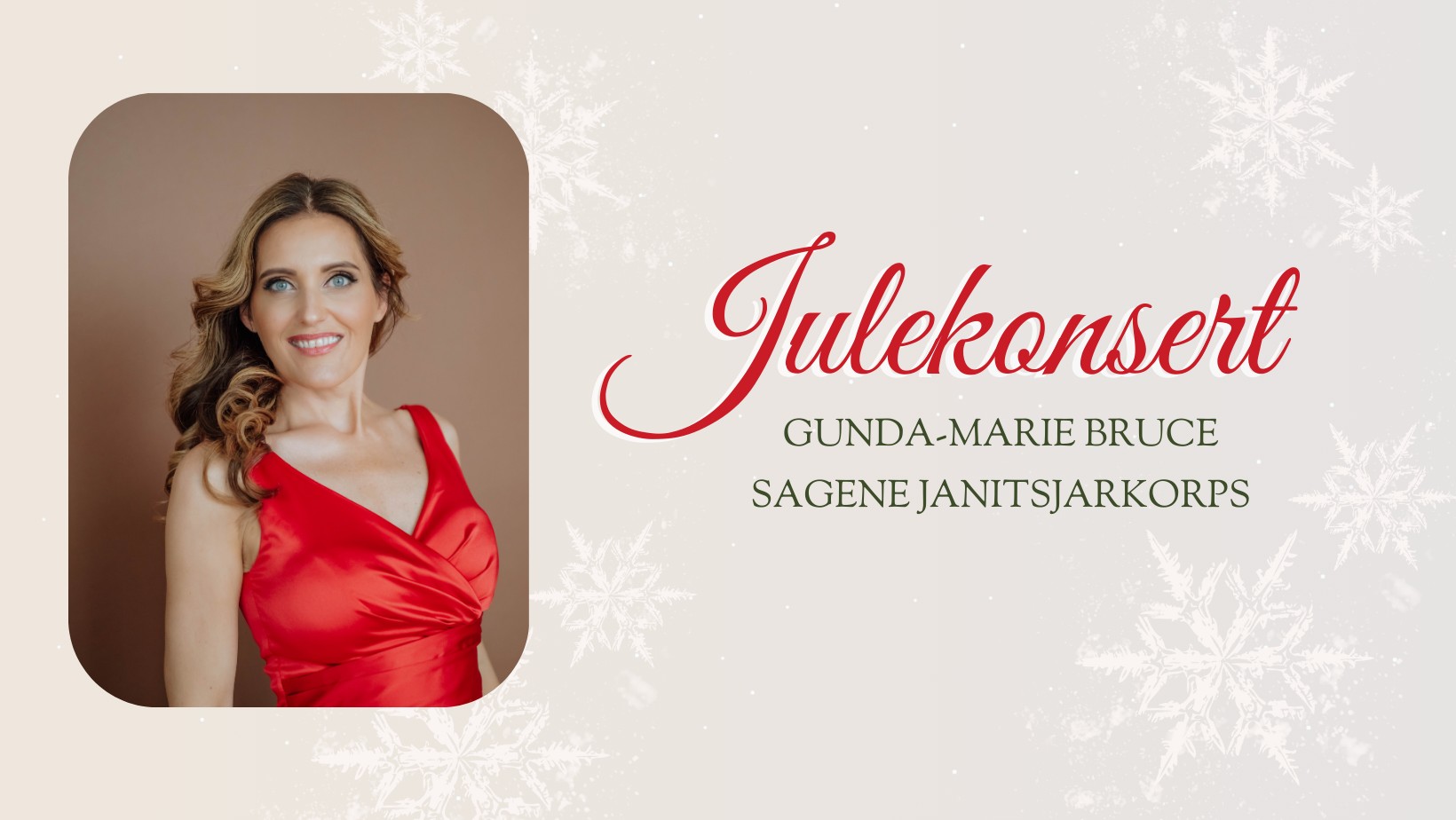 Vi har fått med oss solist Gunda Marie Bruce, som har lang fartstid med korpset. Hun er viden kjent for sin store sangstemme og sitt sprudlende vesen. Hjertelig velkommen til en lun førjulskveld med stemningsfull musikk!